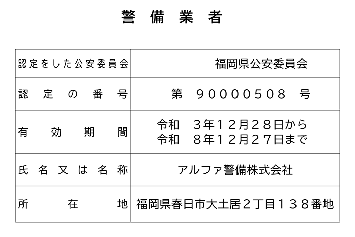 | 警備業認定 | 福岡県公安委員会認定 第90000508号 | |